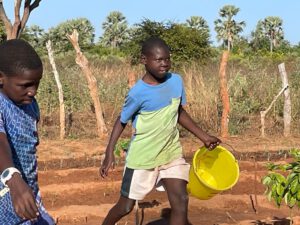 Inzwischen wurde das ganze Gelände mit einem Zaun eingezäunt. Jedes Kind hat am Zaun einen kleinen Baum gepflanzt, den es selbst betreut und bewässert.